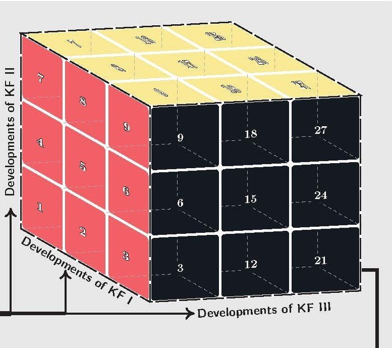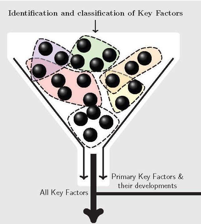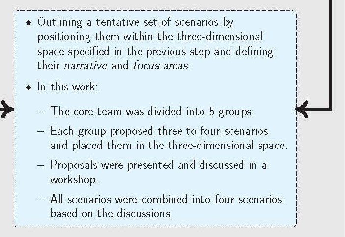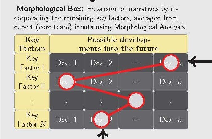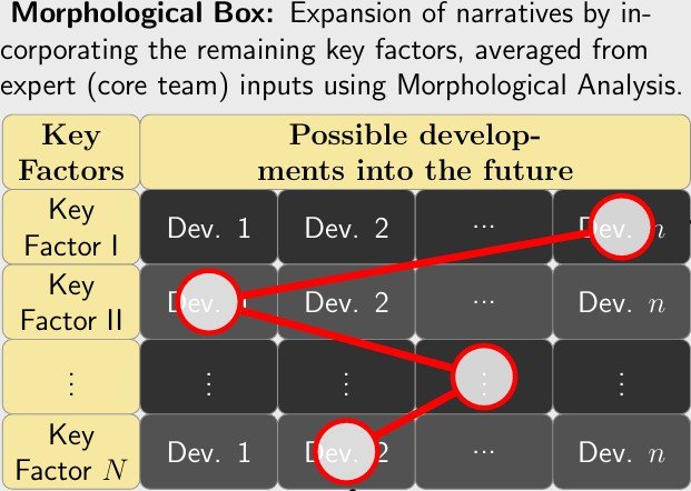 A morphological analysis was used for this purpose. Different groups suggested possible developments for the remaining factors, their proposals were compared and aligned, and a consistent set of assumptions was established for every scenario.